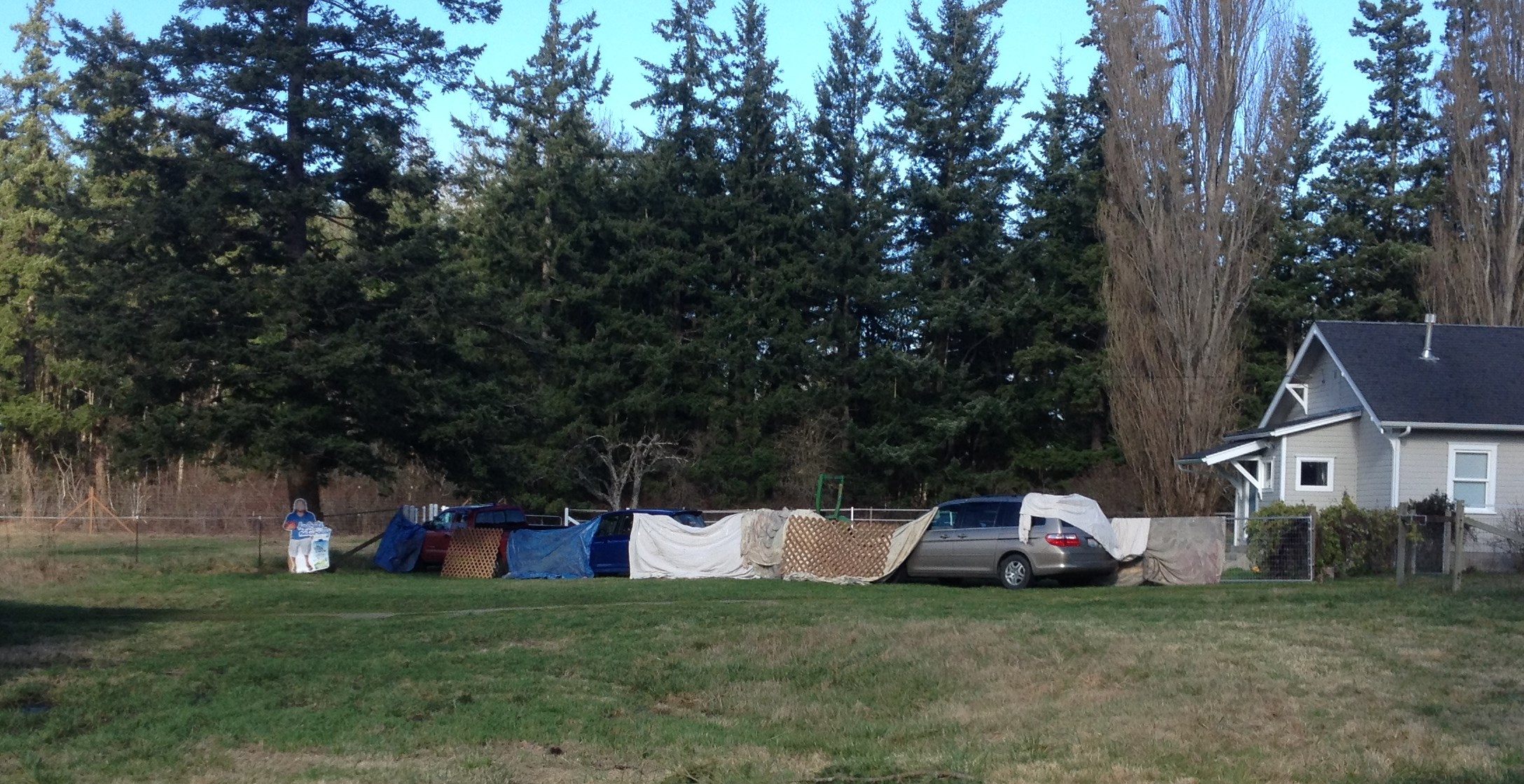We knew this deer could not jump any part of the fence, so the plan was to herd the deer around the perimeter of the property and out the one gate. For this to work, we needed to create a barricade to keep the deer from continuing on past the gate…we lined up 3 cars and the tractor and covered them with tarps.